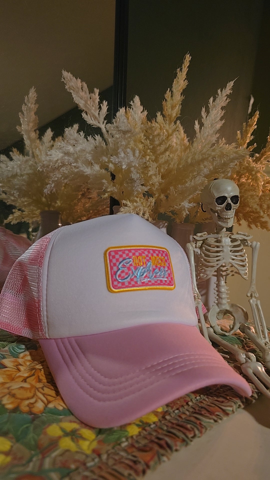 Hot Mess Express Trucker hat. Pink and white checkered back. Super cute for any occasion!